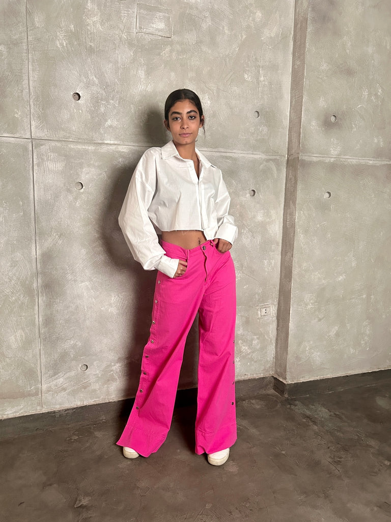 بنطال واسع الساق وردي اللون بأزرار جانبية