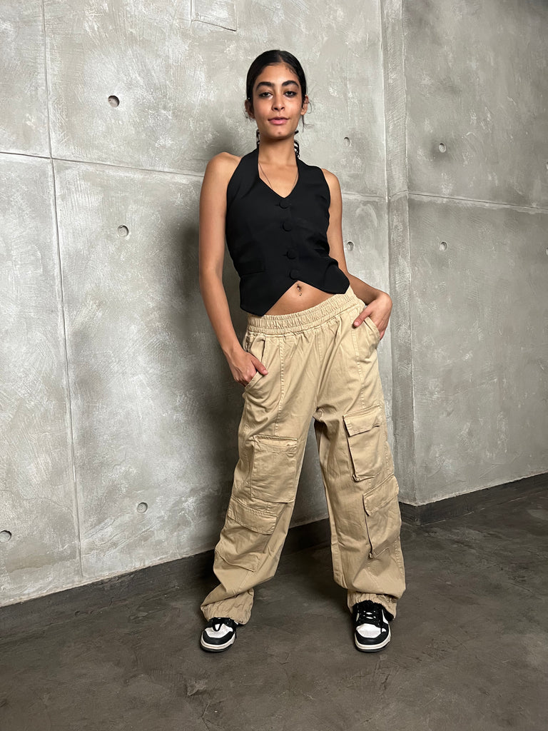 بنطال باراشوت أسود اللون مع جيوب جانبية ورباط على الخصر